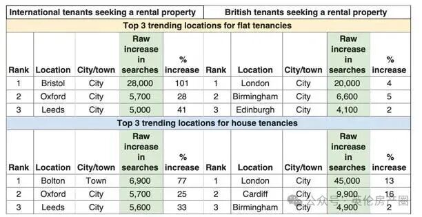 值得一提的是,城市几乎包揽了所有趋势榜单的前三名。在众多城市中,大曼彻斯特地区的博尔顿(Bolton)是唯一一个位居榜首的城镇。而牛津(Oxford)和利兹(Leeds)的国际租客需求显著上升。
