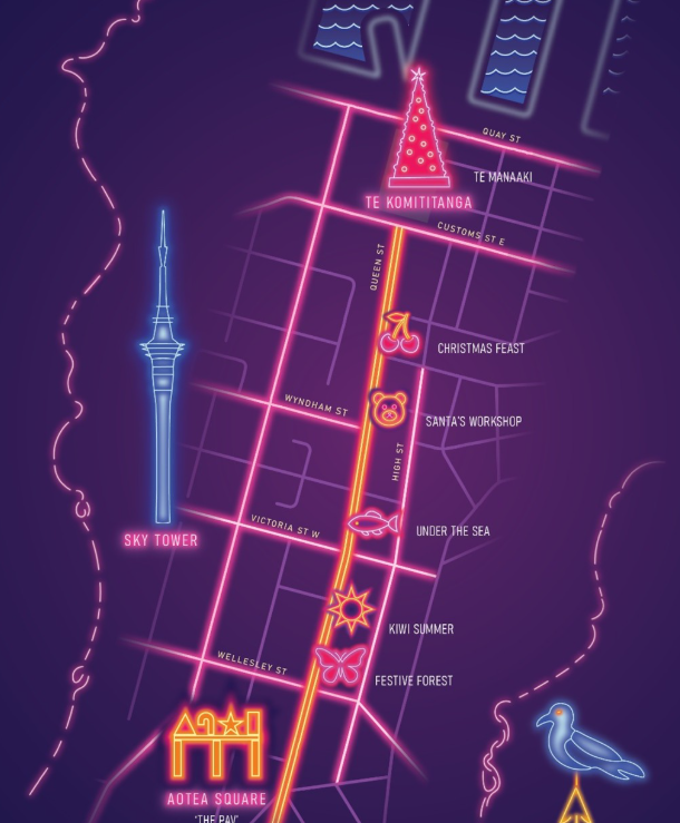从12月1日至圣诞节,五根巨型霓虹柱将点亮皇后街(Queen Street)上的魔幻光之通道。主题包括新西兰风圣诞、圣诞工坊、海底世界、节日森林与圣诞盛宴,呈现奥克兰独有的夏日圣诞风情。