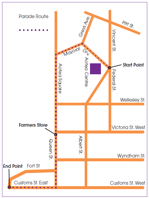 和往年一年,圣诞巡游路线的起点为Federal Street和Mayoral Drive交界处,之后沿着Mayoral Drive来到Queen Street,再一路沿Queen Street向Downtown走,最后在Customs Street East结束。