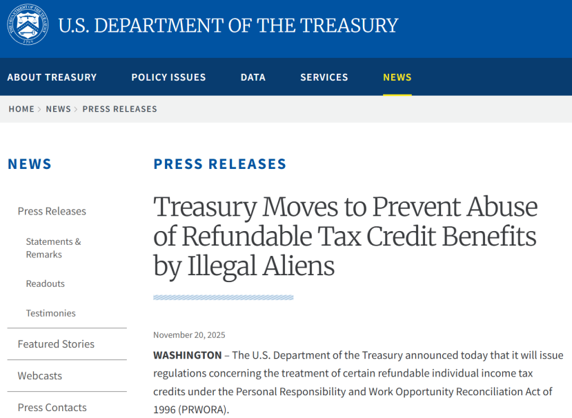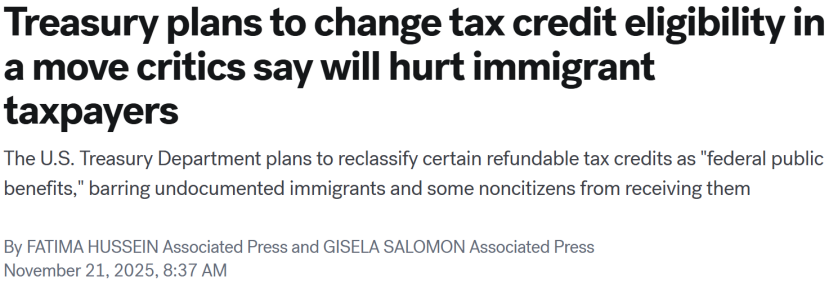 11月20日,美国财政部发布信息称,计划将某些可退税的税收抵免重新分类为“联邦公共福利”,这将禁止一些移民领取这些福利,即使他们已经报税并缴纳税款,且符合其他资格要求。