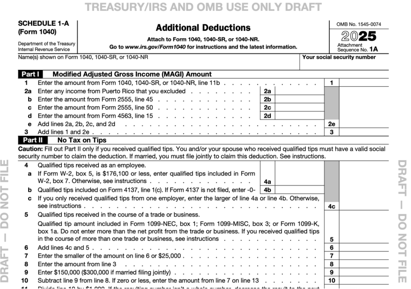 IRS(美国国税局)现已发布了一些2025年的税表草稿(表格将在2026年提交),其中最引人注目的当属全新的《附表1-A:额外扣除项》。该表格的推出,旨在落实新通过的《大而美法案》。