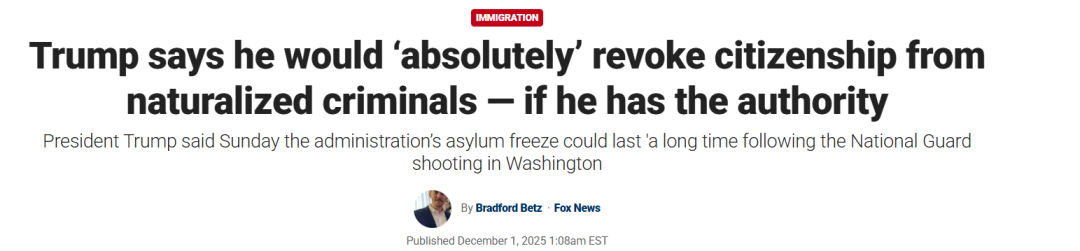 据FOX新闻12月1日报道 川普总统11月30日周日表示,在本周发生国民警卫队枪案后,其政府实施的BH申请冻结措施可能会持续“很长一段时间”,并提出或将撤销部分有犯罪记录的归化移民的公民身份。新闻报道截图