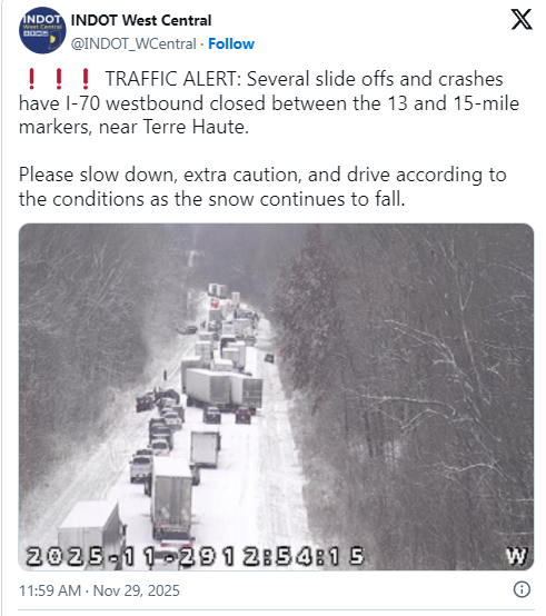 恶劣天气已经造成严重事故。周六,印第安纳州特雷霍特附近的 I-70 高速公路上发生了多达 45 辆车的连环相撞事故,暴雪导致车辆成片打滑,一些甚至冲入对向车道,造成多个车道短暂关闭。