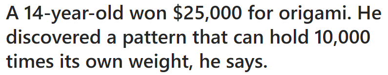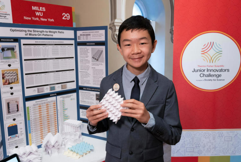 纽约市14岁的华裔少年迈尔斯·吴(Miles Wu)在多数同龄人还在折纸飞机时,已经开始探索如何将折纸技术应用于灾难救援设备。他凭借一项基于「三浦折叠」(Miura-ori)的创新研究,赢得赛默飞世尔科学青少年创新者挑战赛(Thermo Fisher Scientific Junior Innovators Challenge)最高奖,并获得2.5万美元奖金及专家认可。