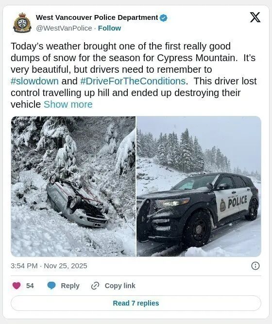 “今天的天气带来了本季最早的优质降雪之一”,11月25日,西温警察在社交媒体上表示,“这里非常美丽,但司机们需要记得减速并根据路况开车”。