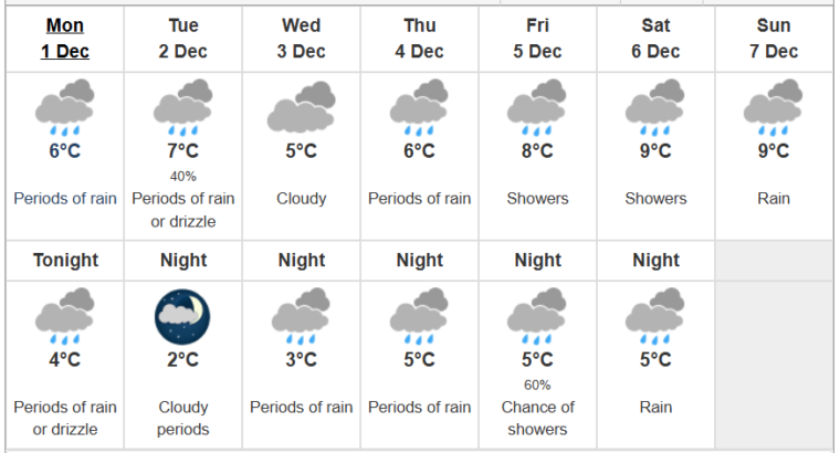 预计夜间(气温将降至 4 摄氏度)将有 10 至 15 毫米的降雨和阵雨,并将持续到周二下午,届时降水预计将逐渐减少。