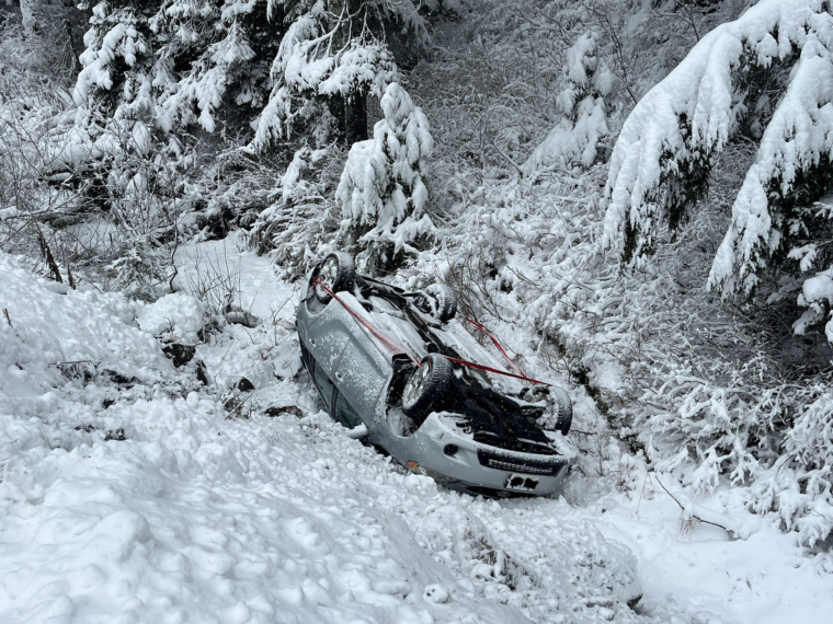 警方在社交媒体上发布的照片显示,一辆车四轮朝天地躺在满是白雪的山坡上,估计是从上面的道路上失控滚落了下来。
