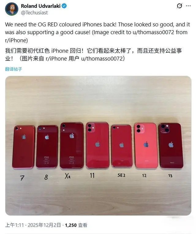 一位名为 Roland Udvarlaki 的用户晒出了从 iPhone 7 到 iPhone 13 的红色系列全家福,并高呼:“我们需要经典的红色 iPhone 回归!它们不仅颜值极高,更是支持公益的象征。”