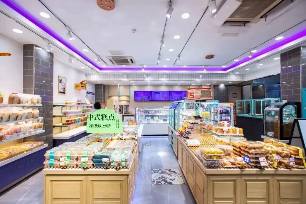 紫色主调保留品牌基因,韩式极简装修契合年轻审美,现烤区与茶饮吧台的创新组合开创“体验式烘焙”先河。