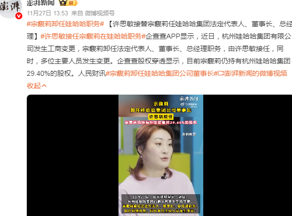 再看本次宗馥莉的正式卸任,背后是权力与资源的彻底切割,工商信息显示,除宗馥莉外,王国祥等多位元老同步卸任,31 岁的许思敏全面接掌董事长、总经理双职。