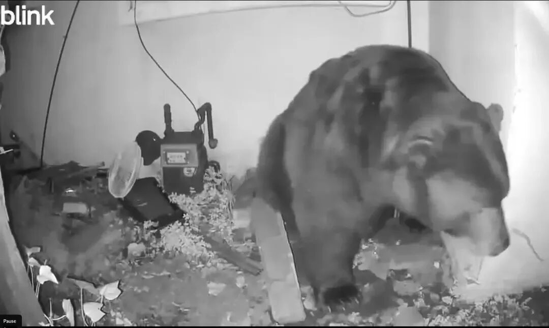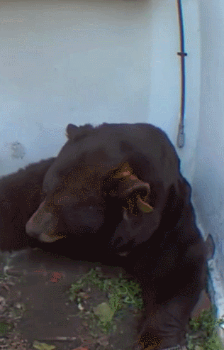 监控录像显示,这头熊体型庞大,毛色偏棕,左耳还带着黄色耳标,正费力地撑起身体,从房子侧面狭窄的通道往外爬。
