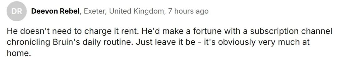 “他都不用跟它收房租了。要是开个付费频道记录这头熊的日常生活,肯定能大赚一笔。就让它住着吧,它明显已经把这当成自己家了。”