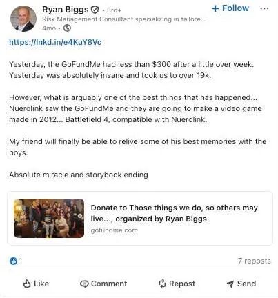 发起众筹的人自称Ryan Biggs,是他的游戏好友,俩人经常一起打《战地4》。