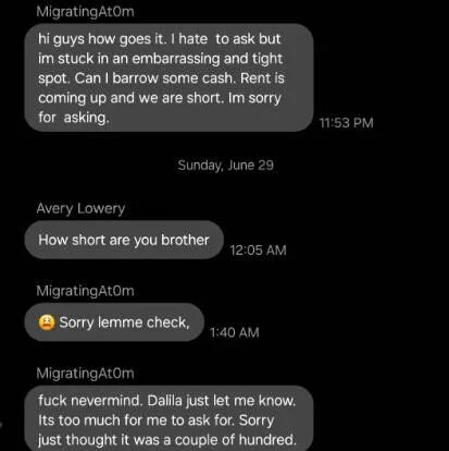 随众筹页面,这位Ryan Biggs还展示了一张聊天截图,内容大致就是房租要交了,Melgarejo很不好意思地想要借钱,最后发现金额太大,他觉得太麻烦朋友了,说不用了。