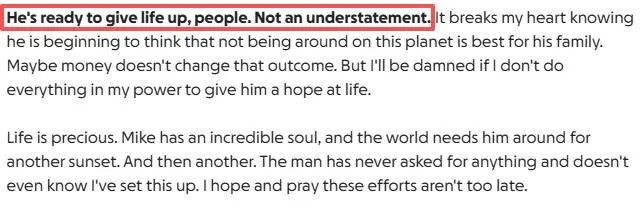 替他发起筹款的人声称他生活在极度痛苦之中,想要自尽: