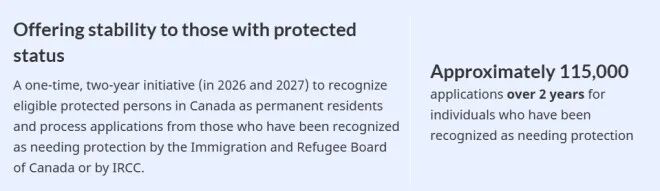 移民水平计划显示,政府会一次性让约115,000名已经在加拿大的受保护人士(protected persons)转为PR,这一措施可能会纳入该新通道。