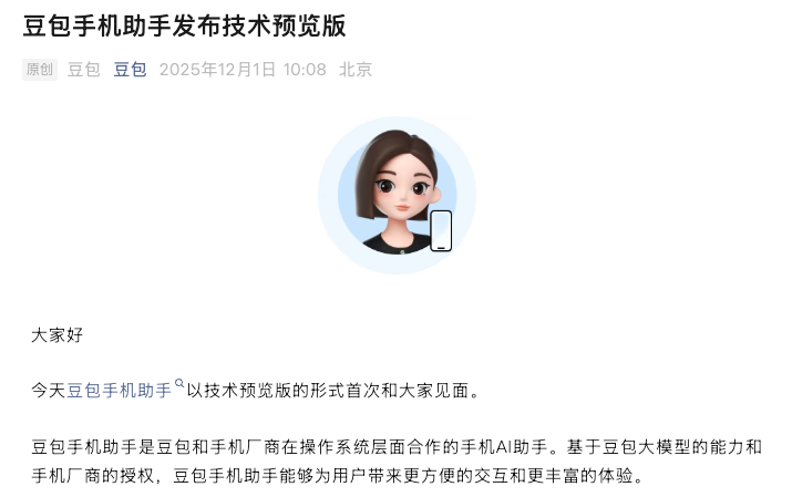 12 月 1 日,豆包发了豆包手机助手技术预览版。