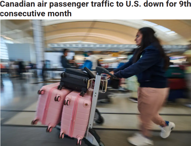 连续第九个月,加拿大机场前往美国的旅客人数在贸易战中持续下降。加拿大统计局的新数据显示,10月加拿大航空旅客总量同比上升4.5%,达到500万名旅客,但前往美国的旅客人数下降了8.9%,至120万人。