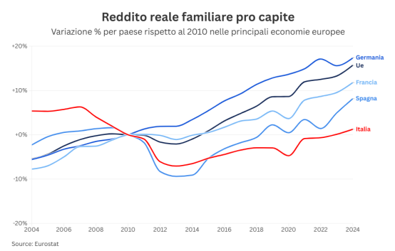 上图则展示了欧盟主要经济体家庭实际收入相较于2010年的百分比变化。意大利仅录得+1.26%的微弱增长,明显落后于德国(+17.35%)、法国(+11.79%)、西班牙(+8.16%)和欧盟平均值(+15.71%)。