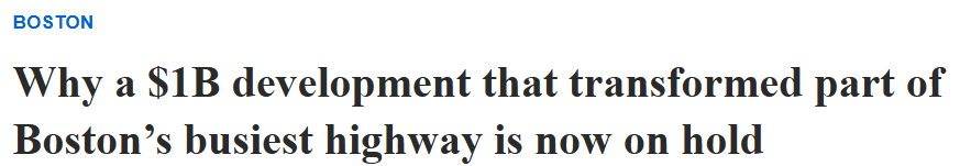位于芬威公园(Fenway Park)附近、横跨麻州收费公路(MassachusettsTurnpike)的一项耗资10亿美元的建设项目现已暂时停工,原因是商业实验室空间的需求已减少。(图片来源:Masslive)