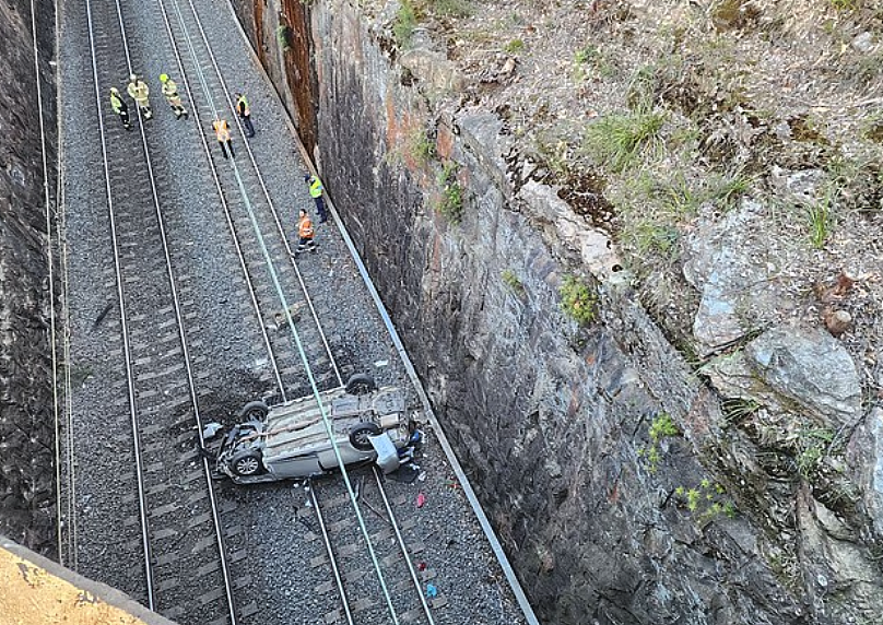 周三清晨,新州蓝山地区一辆汽车自桥上冲出,翻覆至Blaxland火车站的铁轨上,导致蓝山铁路线双向停运,通勤者出行受阻。