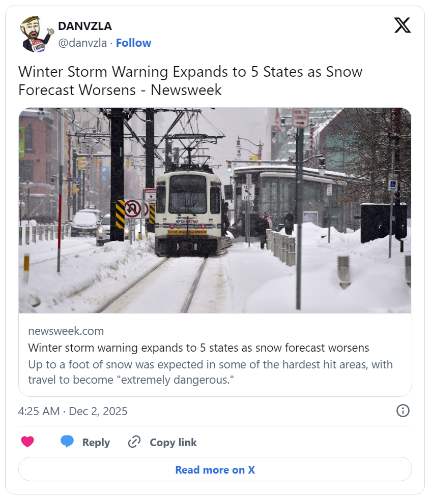 美国国家气象局(NWS)于12月1日下午对冬季天气警告进行了升级,将其提升为冬季风暴预警。随着这场风暴的到来,预计五个州将面临强降雪和恶劣的出行条件,数百万美国人将受影响。根据NWS气象学家Bryan Greenblatt的描述,纽约地区的降雪将从周二凌晨开始,预计会在午后减弱,降雪量可达到1至2英寸。值得注意的是,截止到11月30日,美国大部分地区的降雪量已经是往年同期的两倍。五大湖地区、东北部以及中大西洋地区的降雪将继续增多,另一波强冬季风暴于周二至周三带来更大影响。