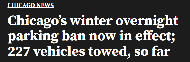 截至周一下午 1 点,芝加哥市政府证实,在夜间停车禁令实施的第一天,共有 227 辆车被拖走。