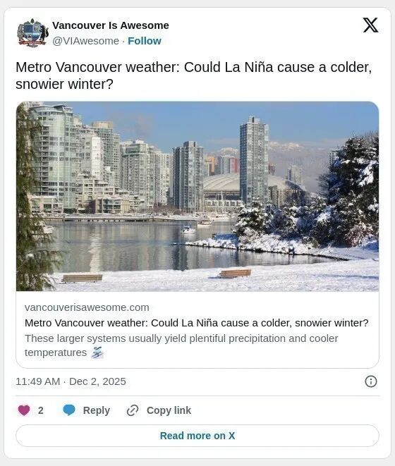 加拿大环境部气象学家 Derek Lee 表示,大温 12 月上半月气温将高于正常水平。