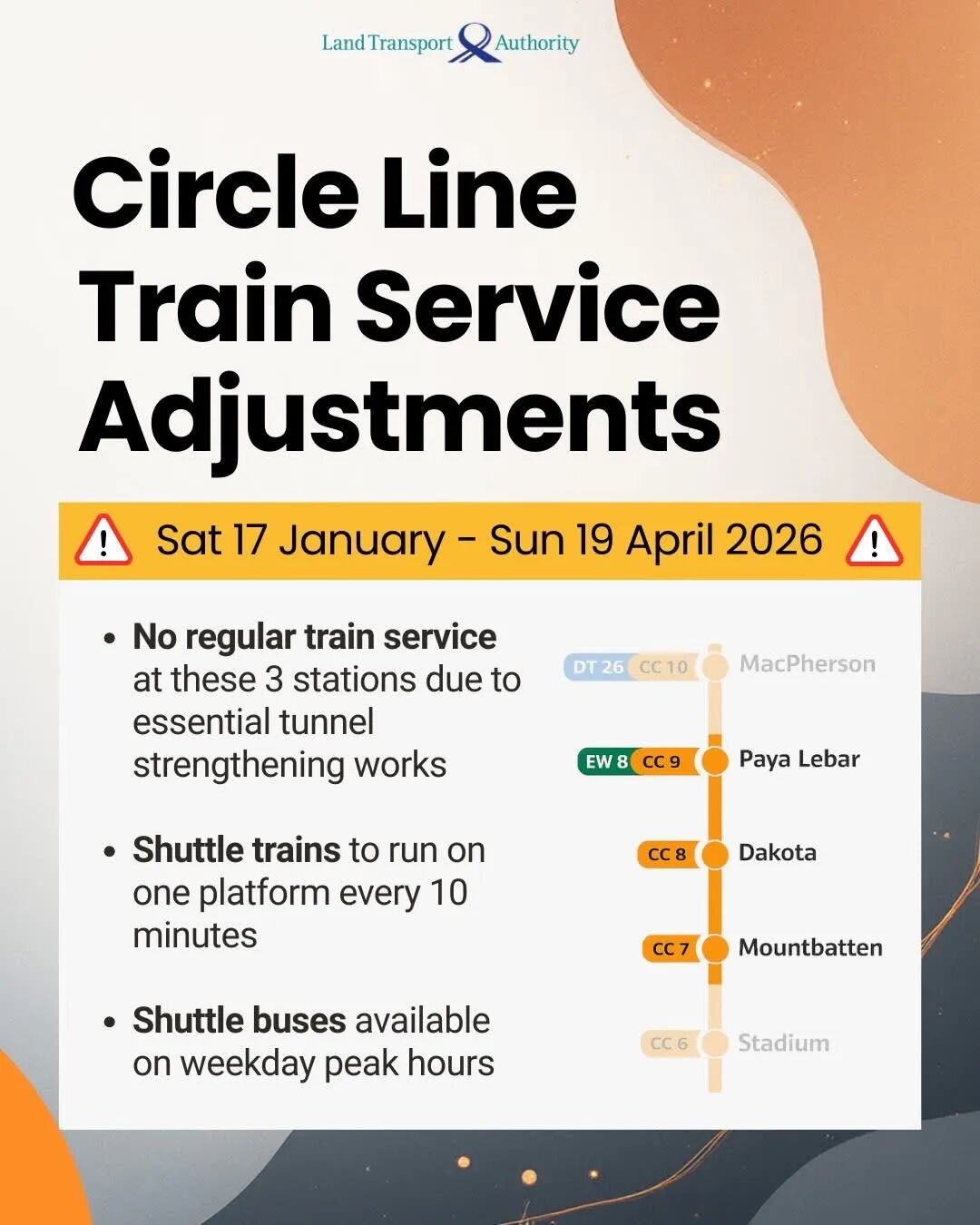 明年年初,地铁环线东部三个地铁站之间的隧道将分阶段封闭进行加固工程,每段关闭约三个月。期间,高峰时段乘客的车程可能会拉长最多30分钟,预计每天约48万人受影响。据路交局12月1日文告宣布,明年1月17日至4月19日,衔接环线巴耶利峇站(Paya Lebar)、达科达站(Dakota)和蒙巴登站(Mountbatten)的两条地铁隧道将轮流关闭,只开放一条隧道供列车运行。