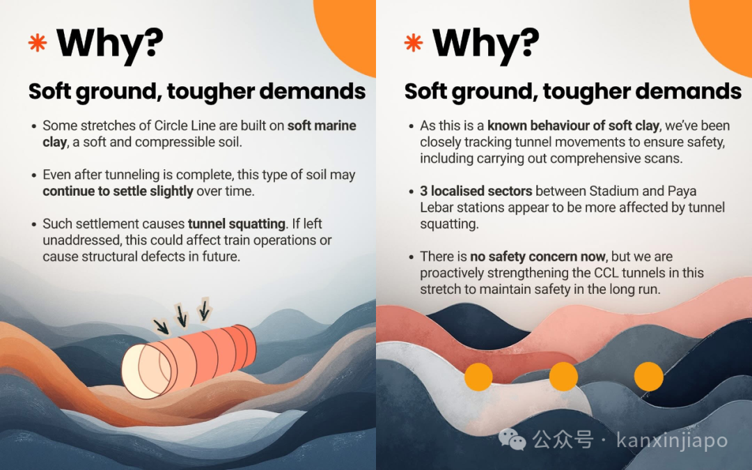 据陆交局说,这一段环线隧道建在非常松软的海泥层上。随着时间推移,海泥慢慢固结,把原本圆形的隧道挤压成椭圆形。如果不在内部加装钢板,隧道结构可能出现问题,严重的话会影响列车服务。