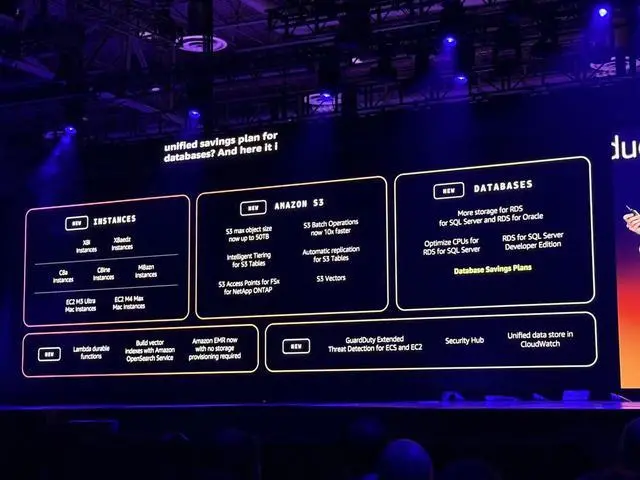 存储方面,包括将S3最大对象大小从5TB提高到50TB,增加10倍;亚马逊S3的数据管理功能S3 Batch Operations更新,在200亿个对象的规模下,完成作业的速度提升10倍;为S3 Tables提供智能分层,节省80%存储成本;S3 Tables支持AWS区域和账户间自动复制;扩展Amazon S3接入点,支持Amazon FSx for NetApp ONTAP;用于存储和查询向量的对象存储S3 Vectors全面上市;利用GPU提升向量索引构建效率,速度提升10倍,仅需1/4成本。