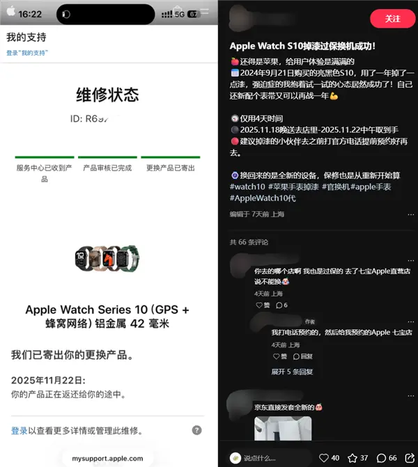 值得注意的是,在小红书上,也有不少用户晒出亮黑色Apple Watch S10掉漆的照片,部分已经过保的用户在联系苹果后同样成功更换新机。
