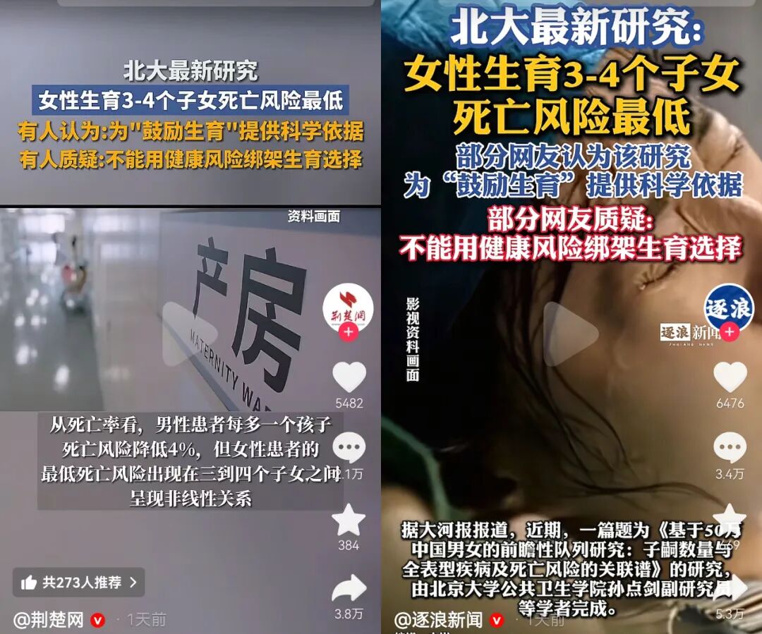全部都是写这个标题:女性生育3到4个子女死亡风险最低。