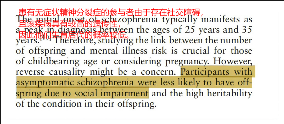 比如精神疾病患者可能有社交障碍,最后不结婚,那就无子女了。