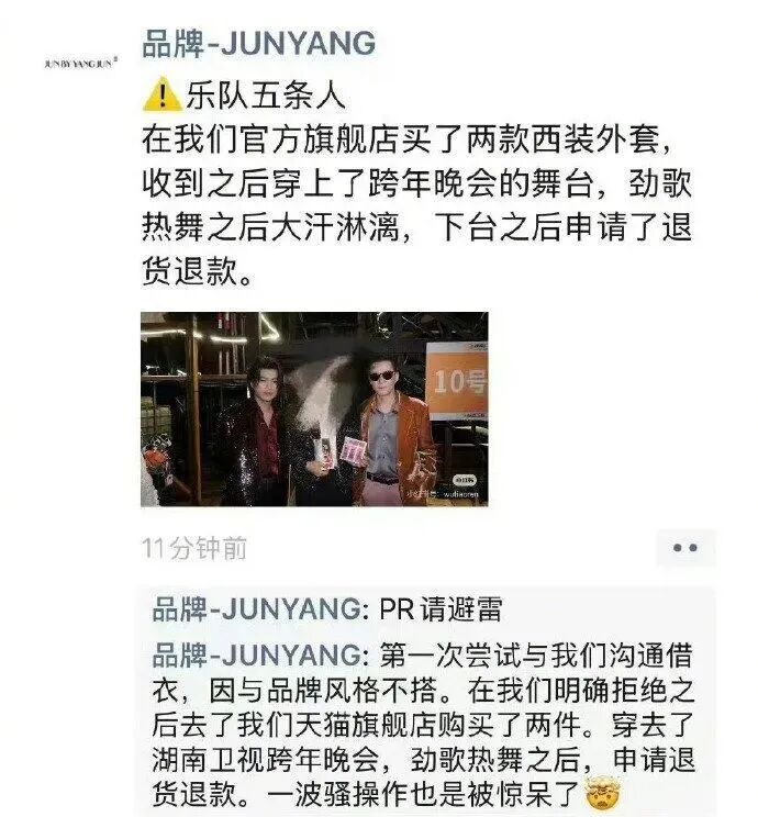 今年年初,就有服装品牌爆料,五条人乐队穿着自家品牌的衣服热舞演出,大汗淋漓之后扭头就申请了退货退款。