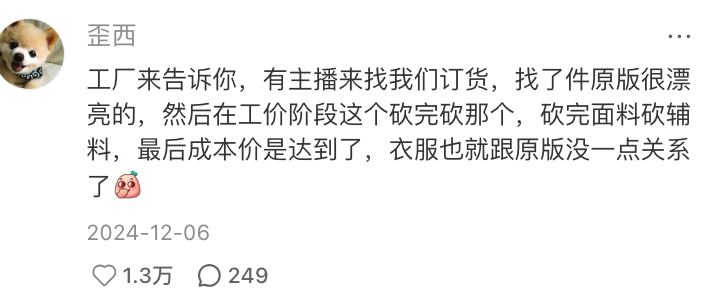 为了不让自己的吃相过于难看,服装又回到了大家最熟悉的价格战。品质参差不齐、版型图文不符,回头客已经不指望了,能赚一单就赚一单。
