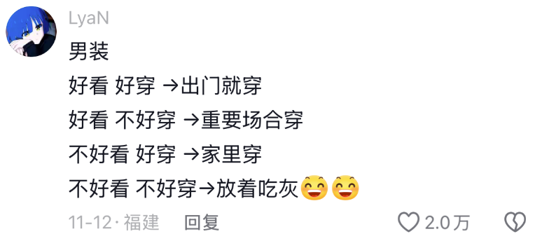 只不过男生从挑选一件衣服到留下一件衣服的逻辑链条和女生完全不同,所以许多衣服即便现在不合适,也都放在衣柜里等待属于它的场合了。