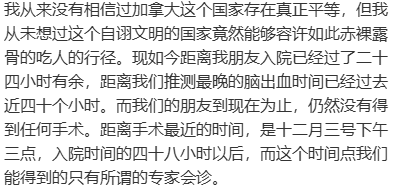 一位网友发文爆料称:自己的朋友因脑溢血被送往密西沙加医院,医院却48小时不作为,不手术也不控制颅压!期间安排了四场CT,而等第四场CT结束的时候已经是第二天的临近中午,没有任何手术救助。