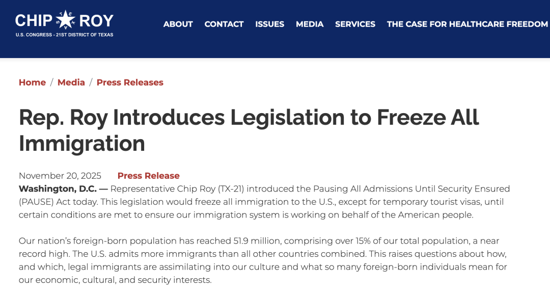 据Financial Express12月2日报道 美国共和党众议员Chip Roy日前正式提出《暂停所有入境直至安全确保提案》(PAUSE Act),意在全美范围内冻结几乎所有合法移民入境,仅为短期旅游者开放权益。若提案最终通过,将从根本上改变当下美国的移民结构,对全球数百万计划来美工作和学习的人士造成直接冲击。新闻报道标题截图