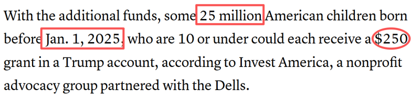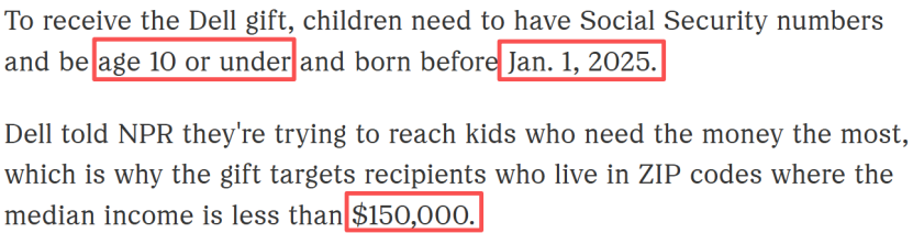 戴尔夫妇的这笔捐赠主要发放给2025年以前出生、10岁以下、不符合特朗普1000美金发放资格的儿童,每人可以获得250美元的资助。这笔资金也是直接存入“特朗普账户”中。