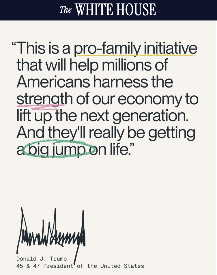 今年夏天美国国会通过了《大而美法案》,其中有一条就是——儿童投资账户设立,即为“特朗普账户”。