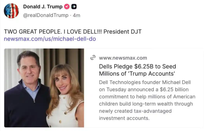 好消息是,12月2日(本周二),戴尔科技创始人迈克尔·戴尔(Michael Dell)携妻子苏珊·戴尔(Susan Dell)宣布将捐赠62.5亿美元,用于支持美国儿童的“特朗普账户”计划。为额外约2,500万名美国儿童提供补助,以弥补这一“资格空白”。