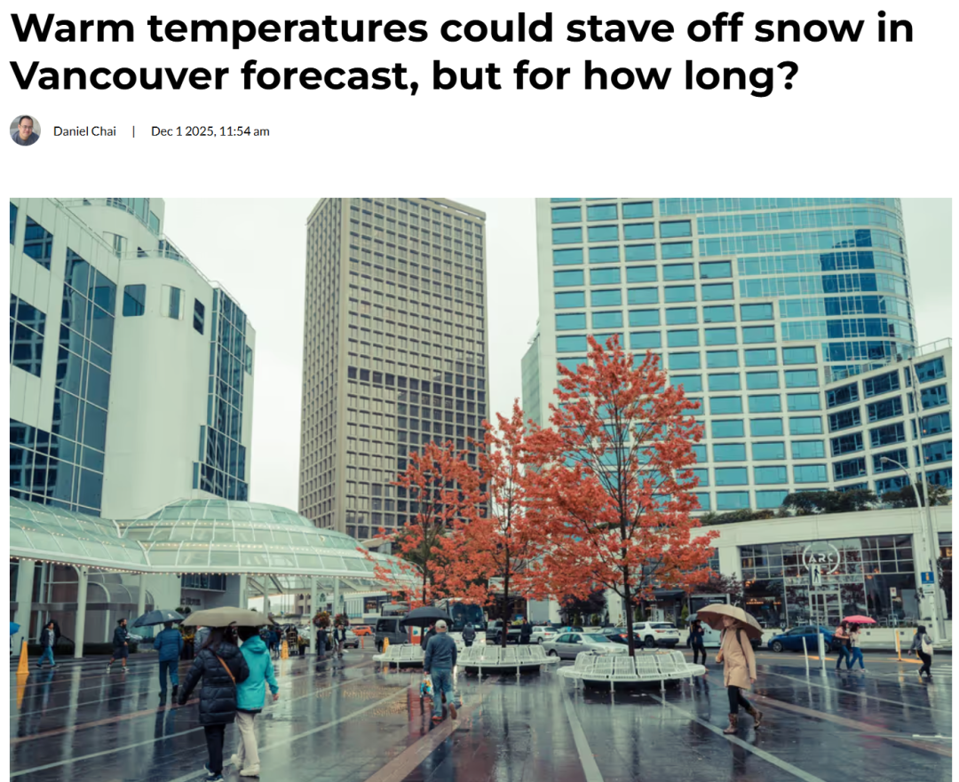 和十一月底那段极限降温的湿冷不同,温哥华十二月的天气预报已经出来了,整体基调可以用两个词概括:湿、暖。根据加拿大环境与气候变化部门的气象学家 Derek Lee 介绍,本月上半段温哥华的气温会高于往年同期,目前没有看到任何降雪迹象。