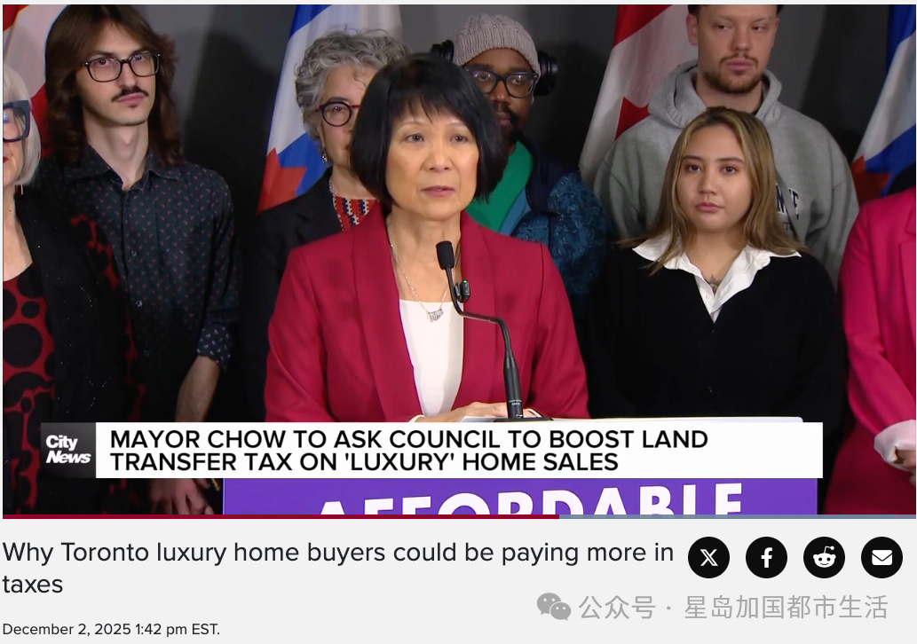 多伦多市长邹至蕙(Olivia Chow)正计划进一步加重豪宅买家的税务负担,拟提高售价300万加元以上住宅的市政土地转让税(Municipal Land Transfer Tax)。这项提案既是市府为下年度预算铺路的关键政策,也被视为她可能参选连任前的重要政治信号。豪宅税全面上调:涨幅最高超过1个百分点
