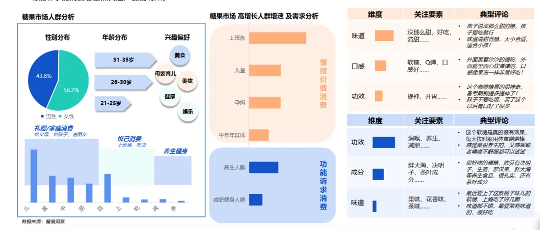 魔镜洞察研究数据显示,目前糖果消费主力人群年龄介于21岁至35岁区间,消费场景主要是礼赠/家庭消费、悦己消费以及养生健身。就消费群体来看,女性依然是糖果产品的消费主力,所占比重高达56.2%,远高于男性所占比重43.8%。