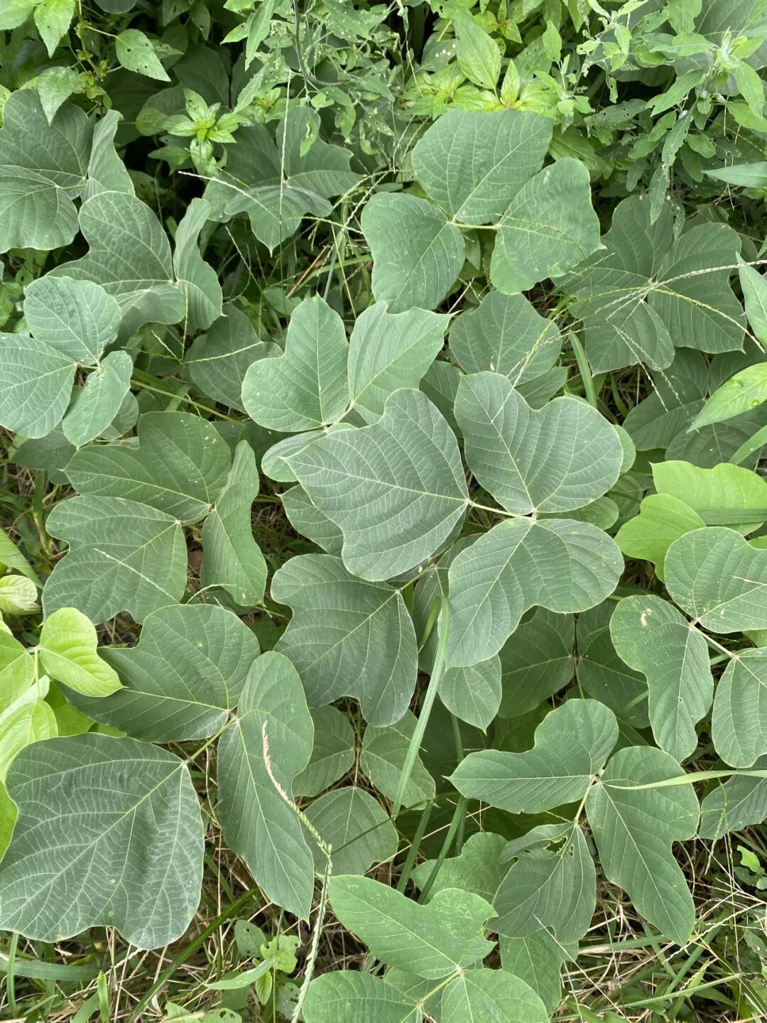 野葛(Pueraria montana)是豆科葛属的多年生大型缠绕藤本植物,可以长到足足30米长。作为豆科的一员,和常见的大豆、车轴草等类似,野葛也有着豆科经典的羽状三出复叶——它长长蔓藤上的每一片复叶都是由三片卵圆形带浅裂的小叶组成,看起来识别度非常高。