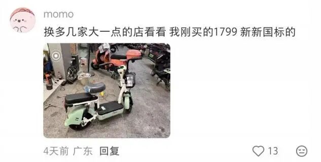 图源:小红书@摩迪美眉也有网友@momo表示,自己刚买到的新国标电动车,啥都有,而且才1799元。