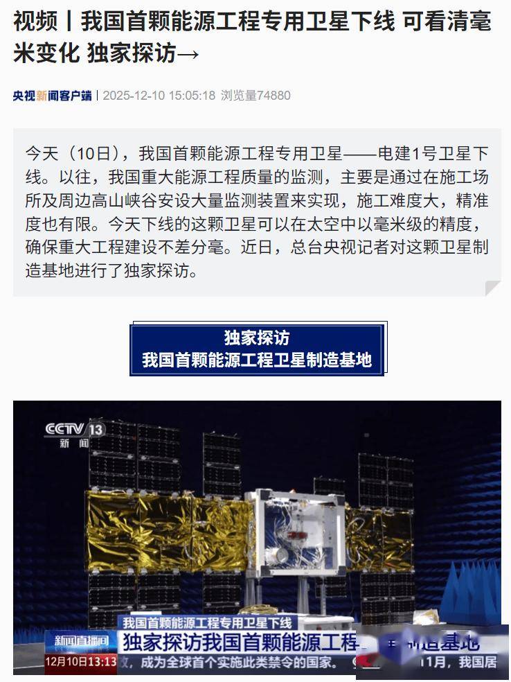 据央视新闻报道,我国首颗能源工程专用卫星 —— 电建 1 号卫星于今日下线。以往,我国重大能源工程质量的监测,主要是通过在施工场所及周边高山峡谷安设大量监测装置来实现,施工难度大,精准度也有限。今天下线的这颗卫星可以在太空中以毫米级的精度,确保重大工程建设不差分毫。
