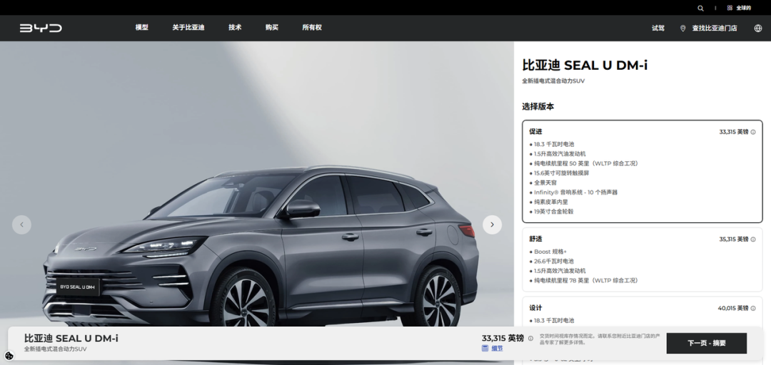 我们去翻了翻比亚迪在英国的定价 ,卖得最好的海豹 U DM-i(也就是我们的宋 plus DM-i),一个三个版本,定价在 3.3 万-4 万英镑左右(折合人民币 31-37 万)。