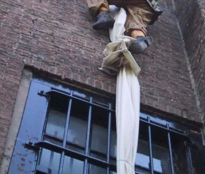 之后,托马给几条床单打结,连成一条简易的绳索,又把“绳索”放出窗外,顺着爬下6米高的窗户,从牢房里逃出来。